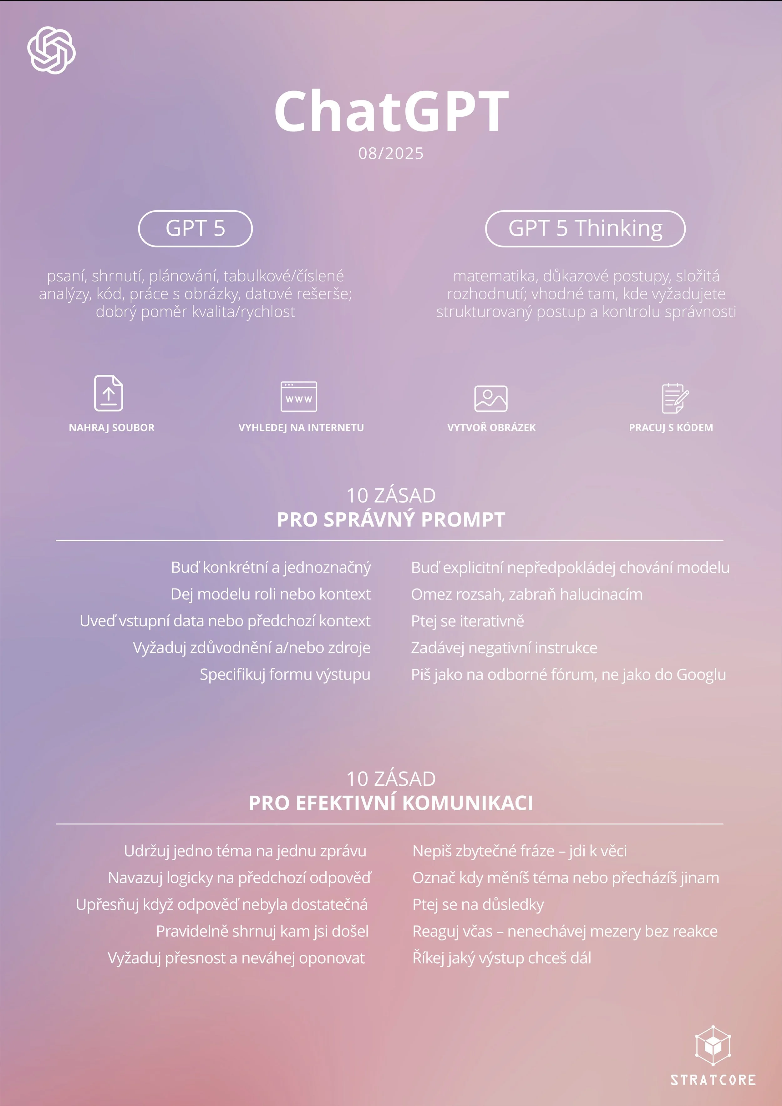jak na chatgpt 5 Aug 17 Written By Lukas Navratil Aktualizovaný přehled modelů GPT 5 a důležitých zásad pro tázání a komunikaci: Otevřít pdf View fullsize Lukas Navratil https://www.lukasnavratil.cz